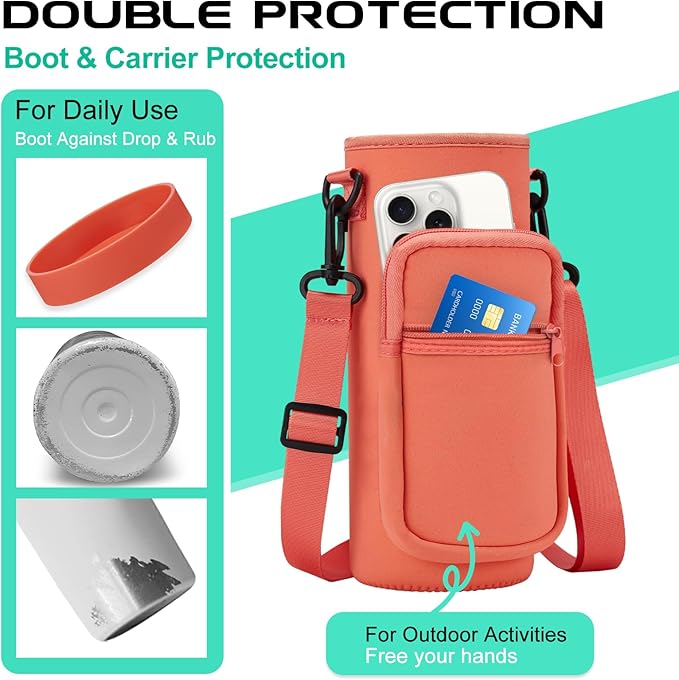 • PROTECTIVE BOOTS & STORAGE CARRIER BAG: Upgraded silicone boots prevent shattering and cracking when stainless steel water bottle accidental dropped. The storage carrying pouch made with neoprene material provide extra protect & insulation for your travel water bottle, 2 zippered pockets design to stores cards, keys and phones of any size.