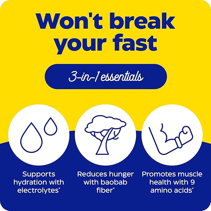 • 3-in-1 Ultimate Drink Mix for Intermittent Fasting: Packed with hydrating electrolytes, baobob fiber for appetite control, & 9 essential amino acids to promote muscle health.*