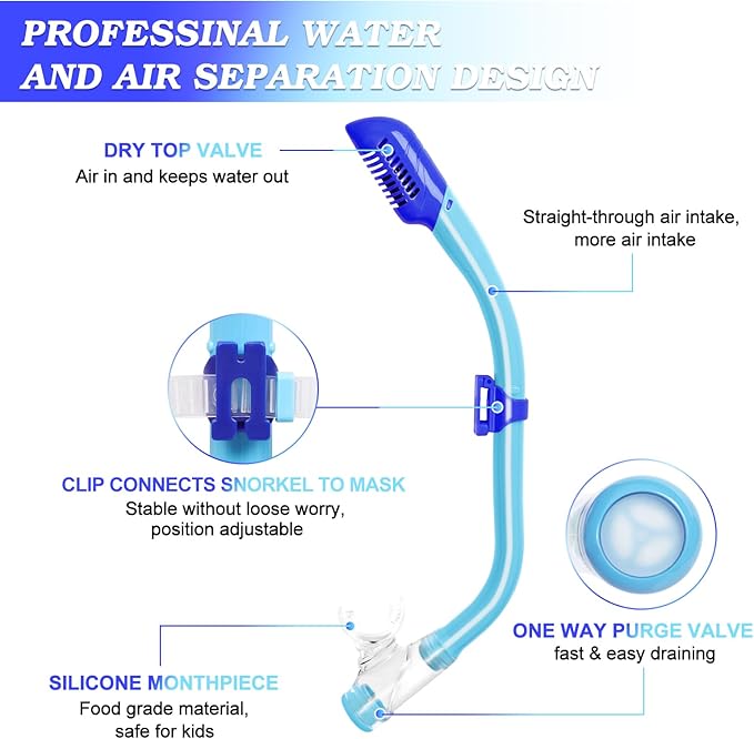 • 【DRY TOP SNORKEL & PURGE VALVE】The Snorkel adopts the most stable dry float valve design. When immersed in water, the top float valve will close automatically to prevent water from entering the breathing tube, the lower purge valve can quickly drain water, so that children will not be choked by water. Food grade soft liquid silicone mouthpiece is durable and safe for children to use.