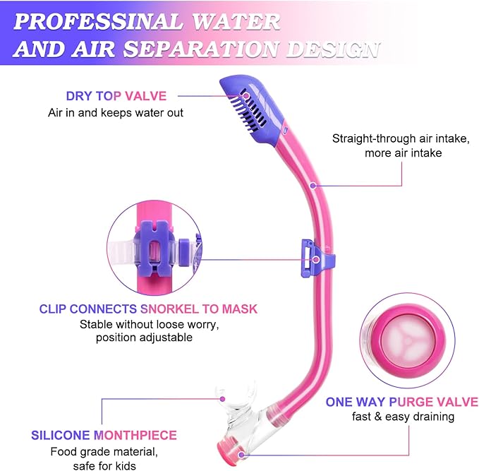 • 【DRY TOP SNORKEL & PURGE VALVE】The Snorkel adopts the most stable dry float valve design. When immersed in water, the top float valve will close automatically to prevent water from entering the breathing tube, the lower purge valve can quickly drain water, so that children will not be choked by water. Food grade soft liquid silicone mouthpiece is durable and safe for children to use.