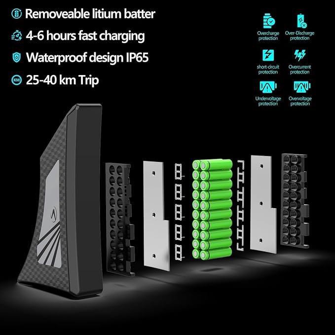 • Ebike with 48V 15Ah removable large capacity lithium battery, 4-6 hours fast charging. Key will firmly lock the battery to the frame, don't worry it easily dropped or being stolen. Battery is removable, waterproof and convenient to bring home or office for charging.