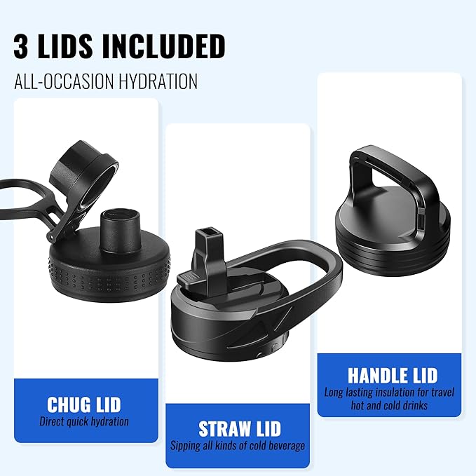 • 3 LIDS LEAKPROOF DESIGN: The 64 oz water bottle with straw is equipped with 3 individual wide-mouth lids to serve all hydration needs, Sip hot drinks, all caps allow for easy one-handed or hands-free sipping when you are busy or on-the-go