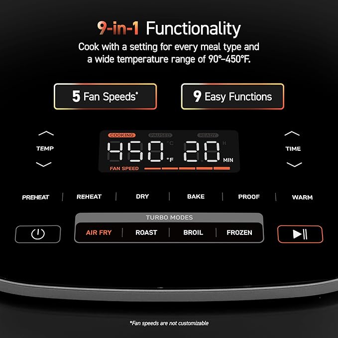 • Product 1: 9-in-1 Versatility: With a 9-in-1 functionality, it includes Air Fry, Roast, Bake, Broil, Dehydrate, Frozen, Proof, Reheat, and Keep Warm, providing versatile options for all your culinary needs.