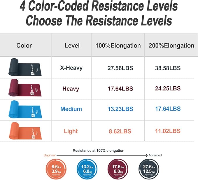 • 【Versatility and Flexibility】 Ideal for Resistance Training, Physical Therapy and Mobility Training, You Can Take a Couple Wraps Around Your Hands for More Tension and a Secure Grip. or Just Tie a Knot, For Use as a Loop Band, and also You Can Double Them Up for Even More Resistance. The Bands are Vibrantly Color-Coded, Once You are Ready for a More Challenging workout, You can Move Up to The Next Color.
