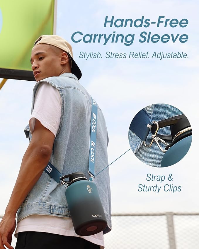 • Unleash Your Style, Hands-Free: Elevate your fashion game with this half gallon water bottle's exquisite adjustable shoulder straps and eye-catching design. Whether worn crossbody, single-shoulder, or hand-held, it's a statement piece that complements your vibrant personality.