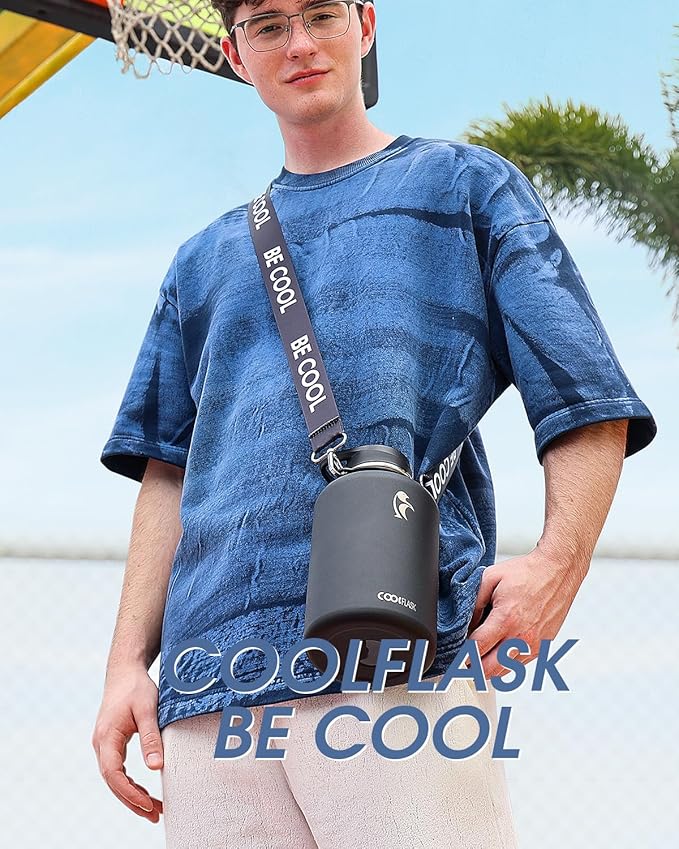 Coolflask 64oz Insulated Water Bottle with Strap, Half Gallon Large Water Jug with Straw & Spout Lids, Double Wall Stainless Steel Metal Flask, Keep Cold 48h Hot 24h, Leak Proof&Non-BPA, Magic Black