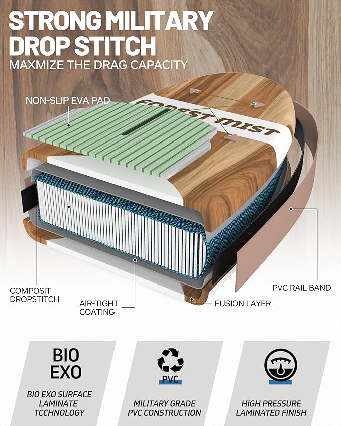 • 【Forest Mist Design & Premium Material】Quickly inflates and deflates for portability, you can carry to anywhere you dreamed for. Boierto use a High tech process to transform military-grade PVC into a rock-solid rigid platform. With a core of composite drop-stitch fibers connected to the nearly indestructible outer skin, the inflatable boards stand up to anything you want to do on the water