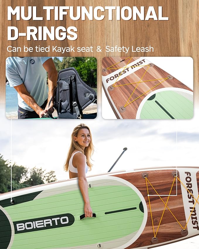 • 【EXTRA STEEL D RINGS】Boierto installs 4 D rings on both sides of the middle part of the paddle board, the kayak seat can be installed on the paddle board through these D rings, or connect your paddle board with your friend's through them,hang your oars, anchors, waterproof bags, or other portable tools