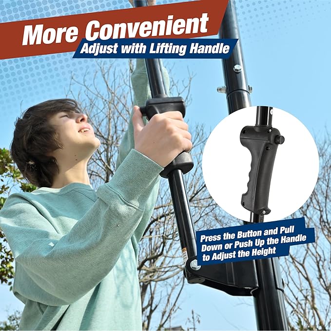 • Quick Height Adjustment for All Ages: Effortlessly adjust the basketball hoop's height from 4.9 to 10 feet with a simple mechanism, making it suitable for kids, teens, and adults. Whether for beginners or seasoned players, this adjustable basketball hoop grows with your skills