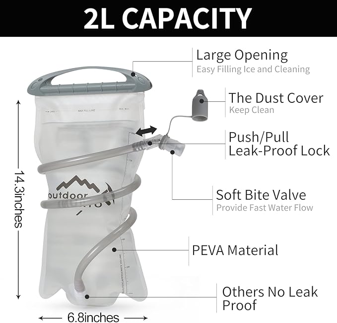 • 🚴‍【Premium Quality Water Bladder】The Hydration Pack Backpack comes with a 2 liter hydration water bladder and two 250ml soft flask. A switch valve and a cover cap make double leak-proof. Large opening allows quick filling of water and ice and it is easy to clean, the water line (40"length,0.4"diameter) provides a wholesome flow for easy drinking keeps your water tasting fresh, all day. The water temperature is range -20~+50℃.