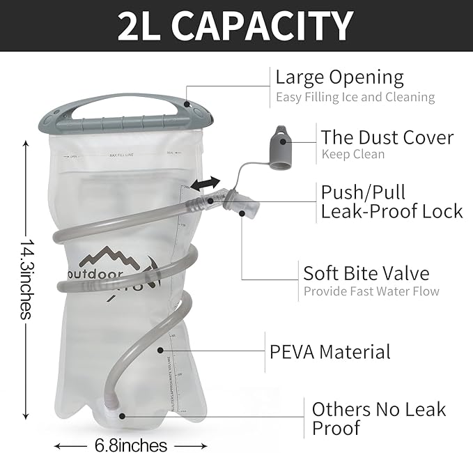 • 🚴‍【Premium Quality Water Bladder】The Hydration Pack Backpack comes with a 2 liter hydration water bladder and two 250ml soft flask. A switch valve and a cover cap make double leak-proof. Large opening allows quick filling of water and ice and it is easy to clean, the water line (40"length,0.4"diameter) provides a wholesome flow for easy drinking keeps your water tasting fresh, all day. The water temperature is range -20~+50℃.