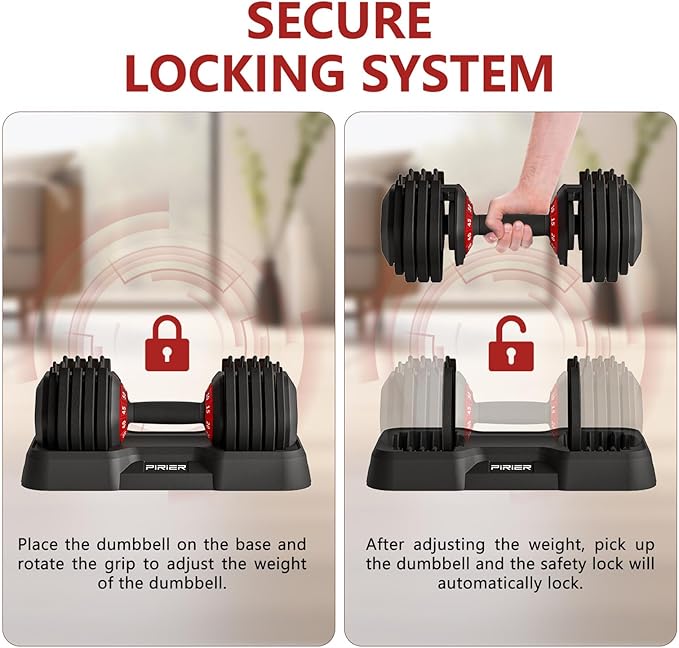 • 【Secure Dual-Locking System】The PIRIER adjustable dumbbell is equipped with a distinctive dual safety locking mechanism. The dumbbell plates are securely attached to the handle via eight locking slots, providing enhanced safety and stability during use