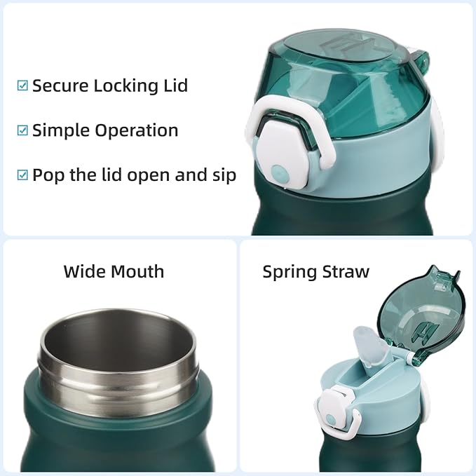 • Equipped with a lockable flip lid and a spring straw, the bottle is leak-proof,left it in your bag without worrying any spills. Simple operation design ensures you Just pop the lid open and sip.Soft silicone spout makes a nice drinking experience.