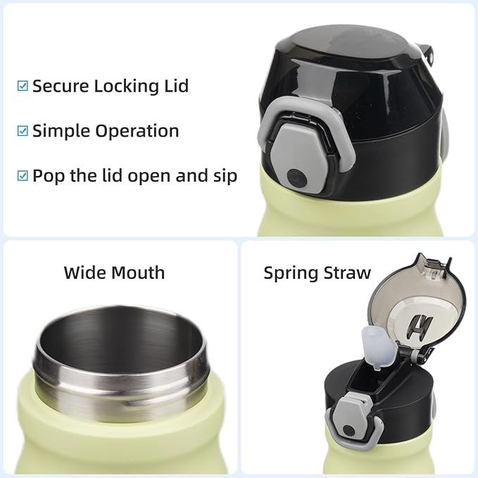 • Equipped with a lockable flip lid and a spring straw, the bottle is leak-proof,left it in your bag without worrying any spills. Simple operation design ensures you Just pop the lid open and sip.Soft silicone spout makes a nice drinking experience.