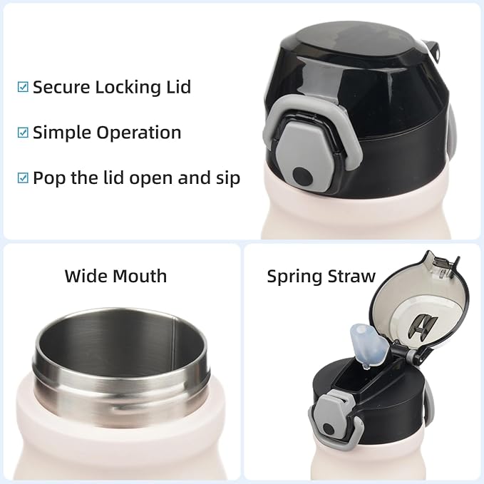 • Equipped with a lockable flip lid and a spring straw, the bottle is leak-proof,left it in your bag without worrying any spills. Simple operation design ensures you Just pop the lid open and sip.Soft silicone spout makes a nice drinking experience.