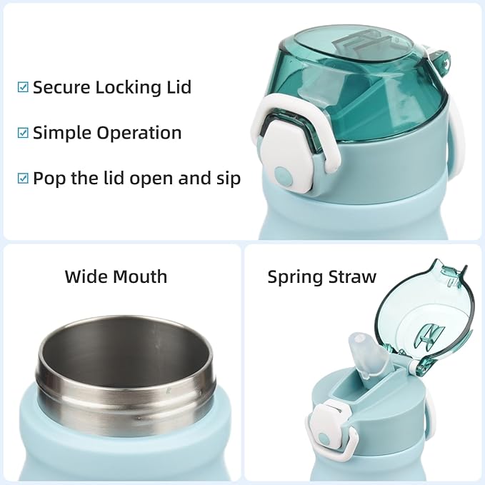 • Equipped with a lockable flip lid and a spring straw, the bottle is leak-proof,left it in your bag without worrying any spills. Simple operation design ensures you Just pop the lid open and sip.Soft silicone spout makes a nice drinking experience.