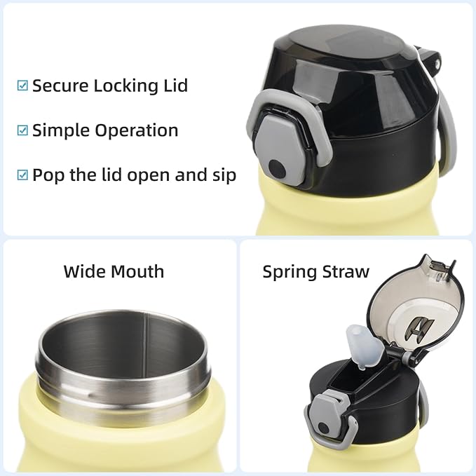 • Equipped with a lockable flip lid and a spring straw, the bottle is leak-proof,left it in your bag without worrying any spills. Simple operation design ensures you Just pop the lid open and sip.Soft silicone spout makes a nice drinking experience.