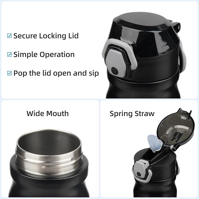 • Equipped with a lockable flip lid and a spring straw, the bottle is leak-proof,left it in your bag without worrying any spills. Simple operation design ensures you Just pop the lid open and sip.Soft silicone spout makes a nice drinking experience.