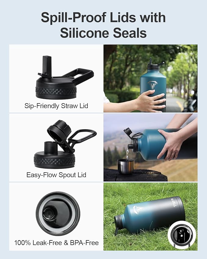 • No Leaks, No Worries: This stainless steel water bottle ncludes two leak-proof lids—a straw lid and a spout lid. Both are equipped with silicone rings to prevent any spills or leaks, and are completely BPA-free for your peace of mind.