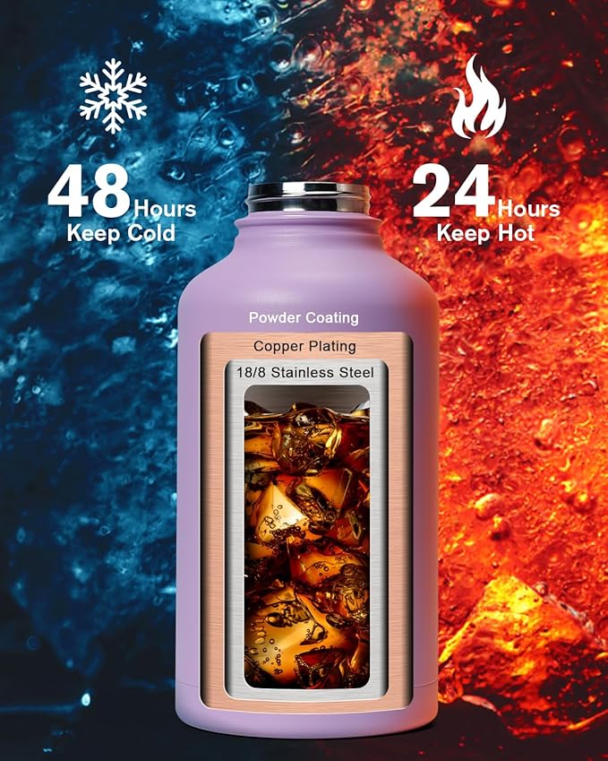 • Cold for 48H & Hot for 24H:Topre 64 oz Half Gallon Insulated Water Bottle features advanced triple-wall vacuum insulation with copper plating, the water flask preserve the freshness and temperature of your drinks throughout the day.