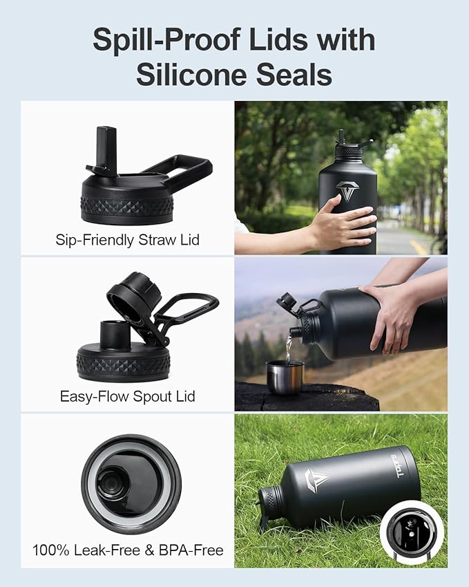 • No Leaks, No Worries: This stainless steel water bottle ncludes two leak-proof lids—a straw lid and a spout lid. Both are equipped with silicone rings to prevent any spills or leaks, and are completely BPA-free for your peace of mind.