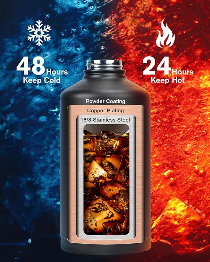 • Cold for 48H & Hot for 24H:Topre 128 oz One Gallon Insulated Water Bottle features advanced triple-wall vacuum insulation with copper plating, the water flask preserve the freshness and temperature of your drinks throughout the day.