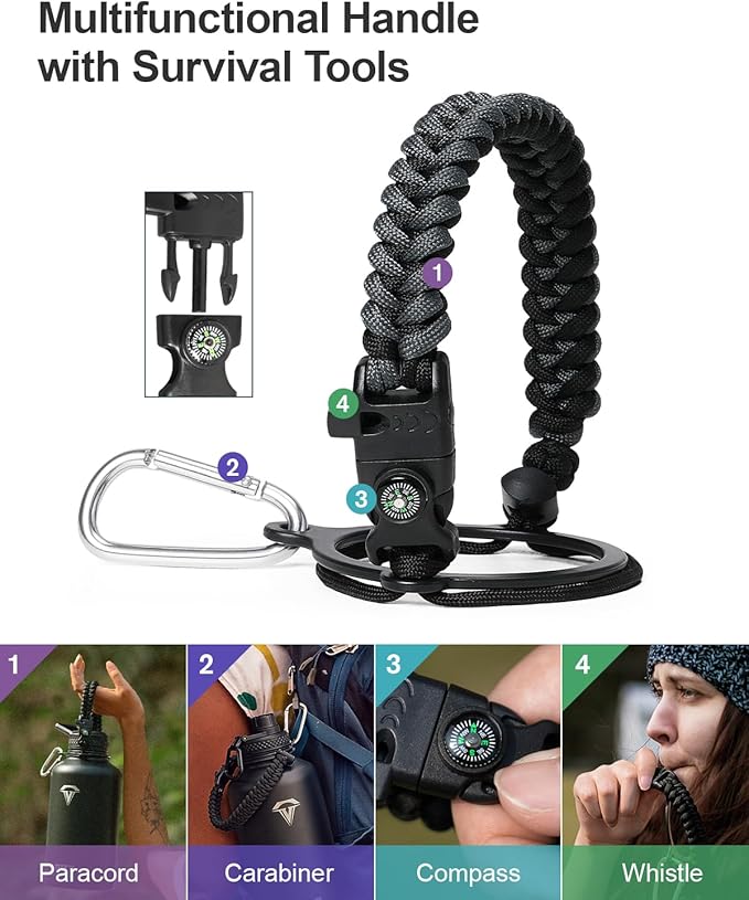 • Ready for adventures: The paracord handle is crafted from sturdy braided rope with an attached survival kit. This includes a compass, a whistle, and a clip, making it an ideal companion for any outdoor activity — be it camping,hiking or exploring new places through travelling.