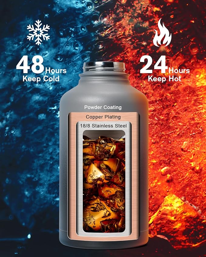 • Cold for 48H & Hot for 24H:Topre 64 oz Half Gallon Insulated Water Bottle features advanced triple-wall vacuum insulation with copper plating, the water flask preserve the freshness and temperature of your drinks throughout the day.