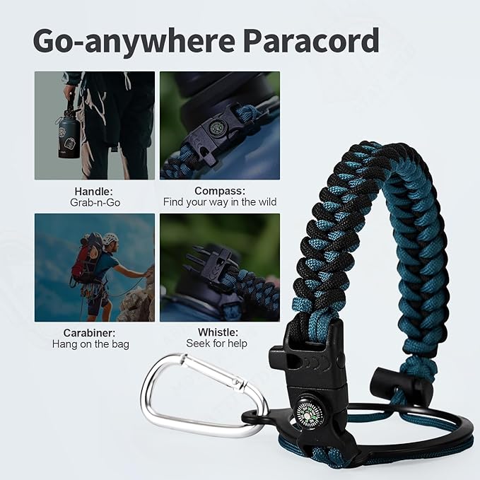 • Palm Fitting Paracord Handle: Compared to handle lids, nylon paracord on the bottle gives you more choices in terms of color coordination and coziness on your hands. Match the handle with your bottle to make a complete outdoorsy look. Compass and carabiner can be lifesavers for hiking and other expeditions