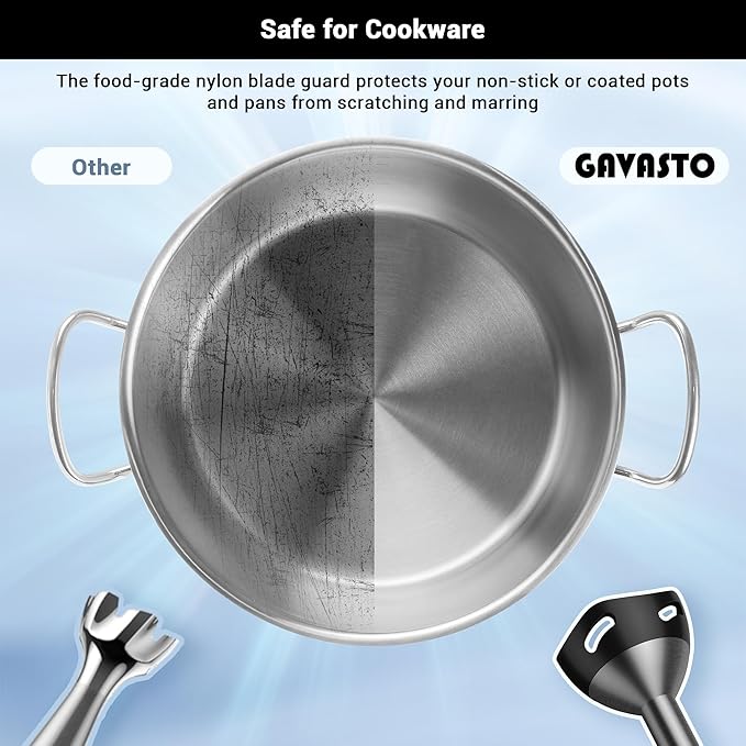 • Say Goodbye to Scratched Containers: Our hand blender stands out from bargain brands with its upgraded blade guard, ensuring your pots, pans, and other containers remain scratch-free. Featuring a unique bell-shaped guard, it not only prevents scratches but also minimizes splashing, leaving your kitchen spotless after each use.