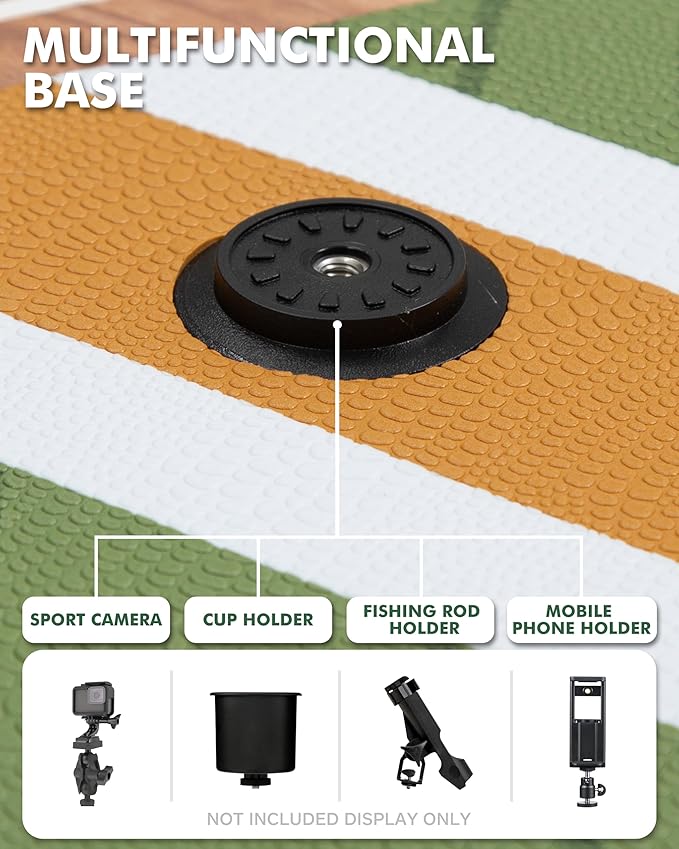 • 【Multifunctional base】The paddleboard multifunctional base can meet various needs. When you are traveling, you can install a cup holder so that you can replenish water anytime and anywhere without stopping, sitting down, opening your package, and so on. When you go out fishing, you can install a fishing rod bracket, place your fishing rod, or place your fish detector. When you want to record your wonderful moments of playing, you can install your sports camera or your phone holder, etc.