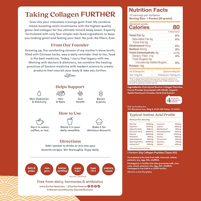 • CLEAN - NO ADDITIVES, STEVIA, FILLERS: Further Food Chocolate Collagen is the ONLY chocolate collagen powder made with real food ingredients. NO gums, flavorings, stevia, or ingredients you can’t pronounce. (Grass-Fed, Pasture-Raised, Keto, Paleo, Sugar-Free)
