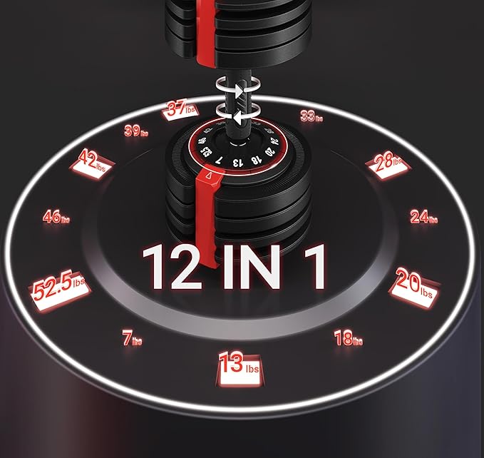 • 12-IN-1 ADJUSTABLE DUMBBELLS:This dumbbell set spans a wide weight range from 7 lb to 52.5 lb in diverse and smaller increments to facilitate gradual resistance, intensity, or volume adjustments.
