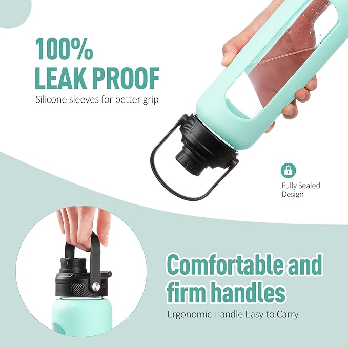 • 24 OZ AND 32 OZ VOLUME FOR OPTIONS - We have 2 sizes for those glass drinking bottles. The 32 oz glass water bottles are perfect for those who require a larger volume of water throughout the day. With this 32 oz bottle(1 liter water bottle), you can stay hydrated without the need for frequent refills. For those seeking a slightly smaller option, we offer the 24 oz glass water bottle, which is ideal for individuals who prefer a more compact and lightweight bottle.