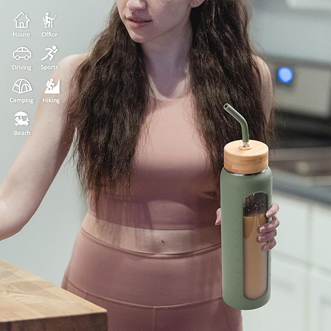 • 24 OZ AND 32 OZ VOLUME FOR OPTIONS - We have 2 sizes for those glass drinking bottles. The 32 oz glass water bottles are perfect for those who require a larger volume of water throughout the day. With this 32 oz bottle(1 liter water bottle), you can stay hydrated without the need for frequent refills. For those seeking a slightly smaller option, we offer the 24 oz glass water bottle, which is ideal for individuals who prefer a more compact and lightweight bottle.