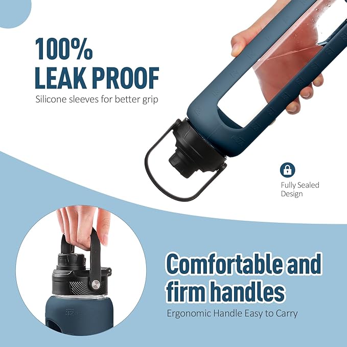 • 24 OZ AND 32 OZ VOLUME FOR OPTIONS - We have 2 sizes for those glass drinking bottles. The 32 oz glass water bottles are perfect for those who require a larger volume of water throughout the day. With this 32 oz bottle(1 liter water bottle), you can stay hydrated without the need for frequent refills. For those seeking a slightly smaller option, we offer the 24 oz glass water bottle, which is ideal for individuals who prefer a more compact and lightweight bottle.