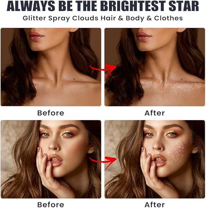 • Multi-Purpose Glitter Spray: Our body glitter spray is made of glitter particles, delivering a charming shimmer effect. You can spray it on your body, hair, face, skin, and even clothes. It will make you the center of attention under the lights at parties or nightclubs