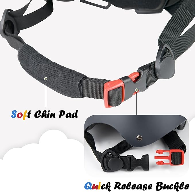 • Fully adjustable, provided by the crank adjustment dial, 2 sets of pads with different thickness, and length-adjustable chin straps