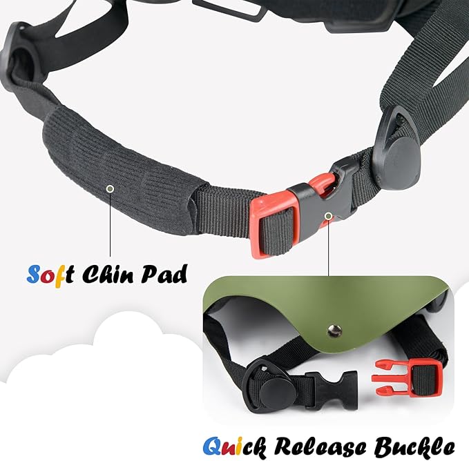 • Fully adjustable, provided by the crank adjustment dial, 2 sets of pads with different thickness, and length-adjustable chin straps
