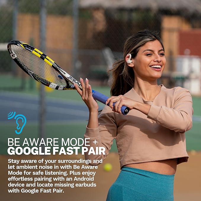 • Be Aware Mode + Google Fast Pair: Stay aware of your surroundings and let ambient noise in with Be Aware Mode for safe listening. Plus enjoy effortless pairing with an Android device and locate missing earbuds with Google Fast Pair