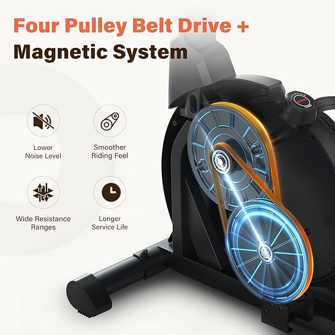 • 【Four Pulley Magnetic System】The SNODE RB10 Recumbent Bike features a quiet and smooth ride thanks to its advanced magnetic resistance system. The magnetic resistance provides a smooth and consistent workout experience, eliminating the noise and vibrations associated with traditional exercise bikes. The bike is also equipped with wheels for easy transportation and storage.