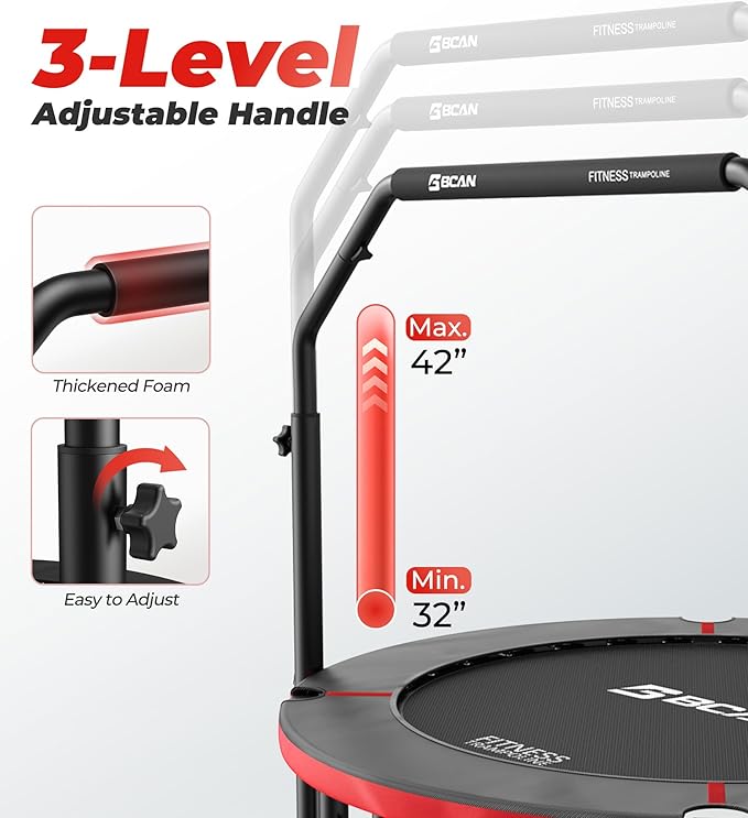 • 3-Level Adjustable Handle: Handle height available from 32'' to 42''. BCAN Rebounder Trampoline for Adults can be adjusted to the height range, ensuring that you can hold the handlebar in the most comfortable position when jumping