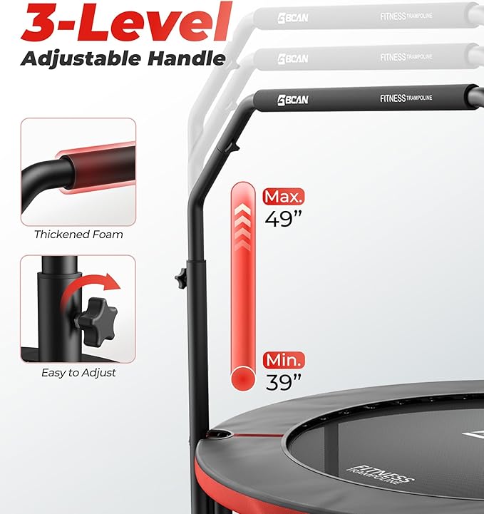 • 3-Level Adjustable Handle: Handle height available from 39'' to 49''. BCAN Rebounder Trampoline for Adults can be adjusted to the height range of the whole family, ensuring that you can hold the handlebar in the most comfortable position when jumping