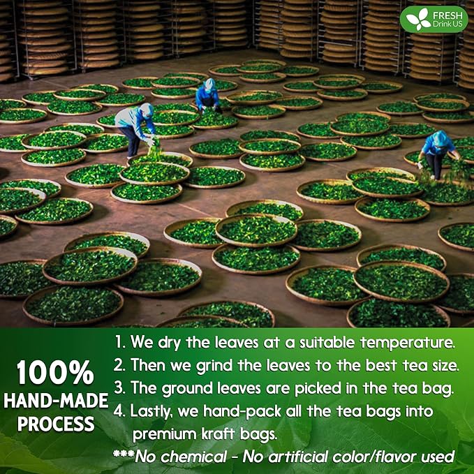 • ☘️ MULBERRY TEA BAS MADE BY A HAND-MADE PROCESS: Mulberry leaves are picked at their flavorful/colorful peak and naturally sun-dried to perfection. We hand-select only the premium leaves of Mulberry for the utmost quality. Then we grind the herbal leaves into the best tea size. Next, we immediately pack it in eco-friendly tea bags. Lastly, we pack the tea bags into food-grade kraft bags for ultimate freshness.