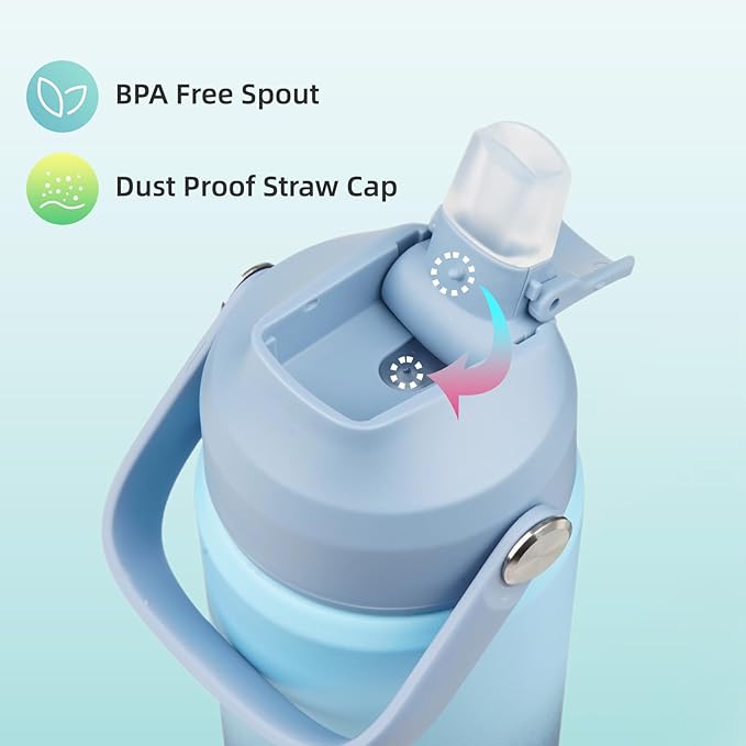 • Soft and durable silicone handle makes the bottle ideal for on-the-go use.Perfect water bottle for daily indoor use or camping, hiking, cycling, gym,travel and other outdoor activities