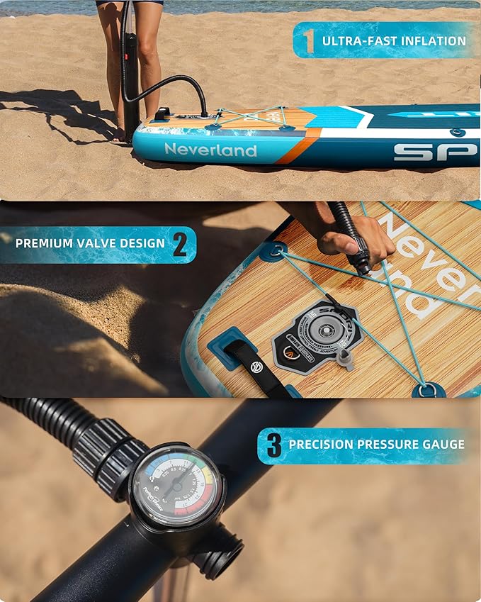 • 【Easy inflation & attractive design】SPORIT inflatable paddle board features convenient inflation and deflation capabilities. Equipped with a dual-action pump and high-end valve, it allows for effortless inflation and deflation. You can have it ready in just a few minutes, making it convenient and quick. Additionally, this paddle board has a stylish and unique design that adds charm and captures attention during your water adventures.