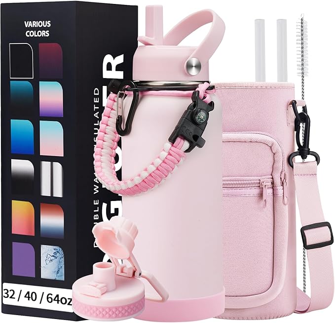 • SUPER JOYFUL COMBO: Buy 32oz insulated water bottles and get 9 accessories (2 x lids, 1 x survival paracord, 1 x carrying pouch, 1 x shoulder strap, 1 x protective cup mat, 2 x straws, 1 x straw brush). WITH A LIFETIME GUARANTEE, these thermal water bottles are perfect gifts for using at home, work, school, road trips, hiking, sporting events, or just hanging out