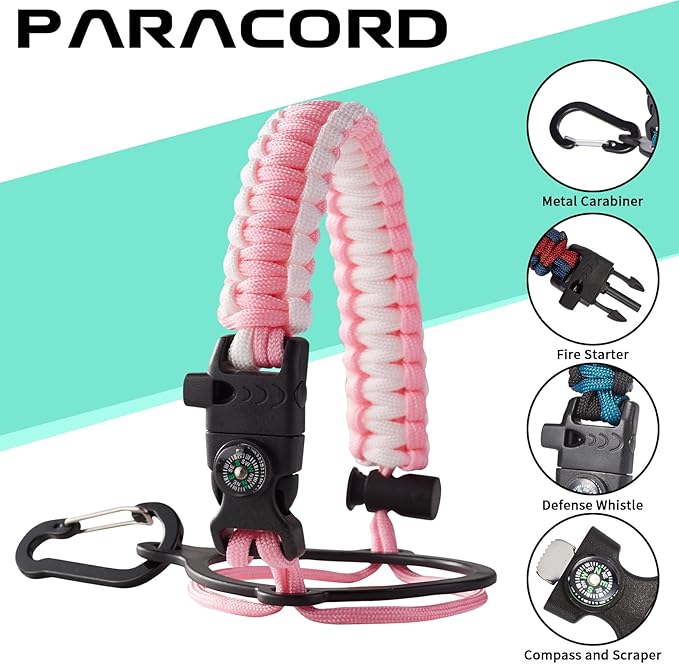• UNIQUE PARACORD HANDLE: Bright color paracord matches the flask water bottle to give you a youthful vibe while adding a personal style. With a compass, safety loop, metal carabiner, flint, igniter and whistle to become your survival tool, making the 32 oz stainless steel water bottle with paracord an ideal survival kit for expeditions in the wild