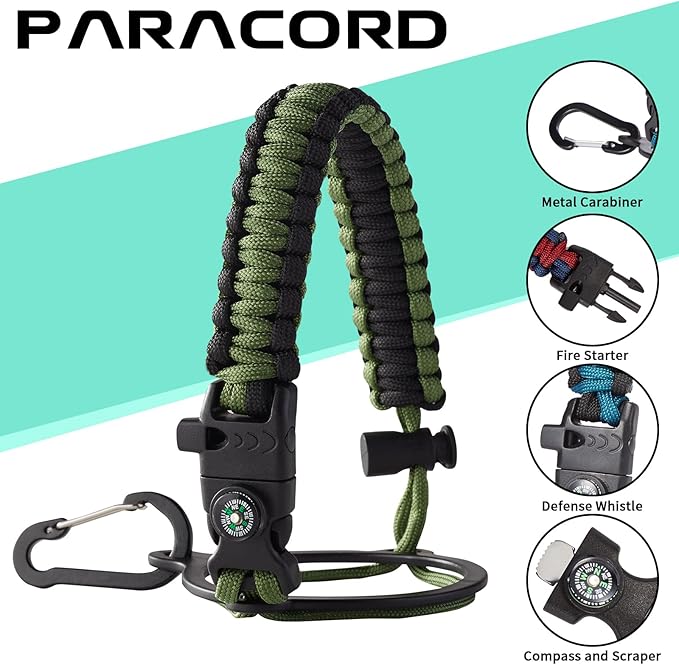• UNIQUE DESIGNS PARACORD HANDLE: Full-function paracord handle made in individual styles to match the color of the flask water bottles. With compass, safety ring, carabiner, flint fire starter & whistle. It unravels into a sturdy and taut rope in an emergency, making the large water jug an ideal survival kit for expeditions in the wild