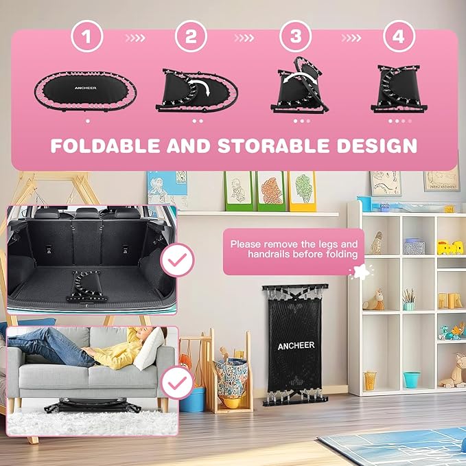 • Easy to Assemble & Foldable Design: 90% of the trampoline body is pre-installed and comes with detailed instructions and installation videos, allowing for quick installation in 20 minutes. The indoor trampoline for kids features a foldable frame design that reduces its size to just 1/3 (4.7 inches) of the original volume for easy storage, with a detachable folding mechanism that requires disassembly for compact storage.